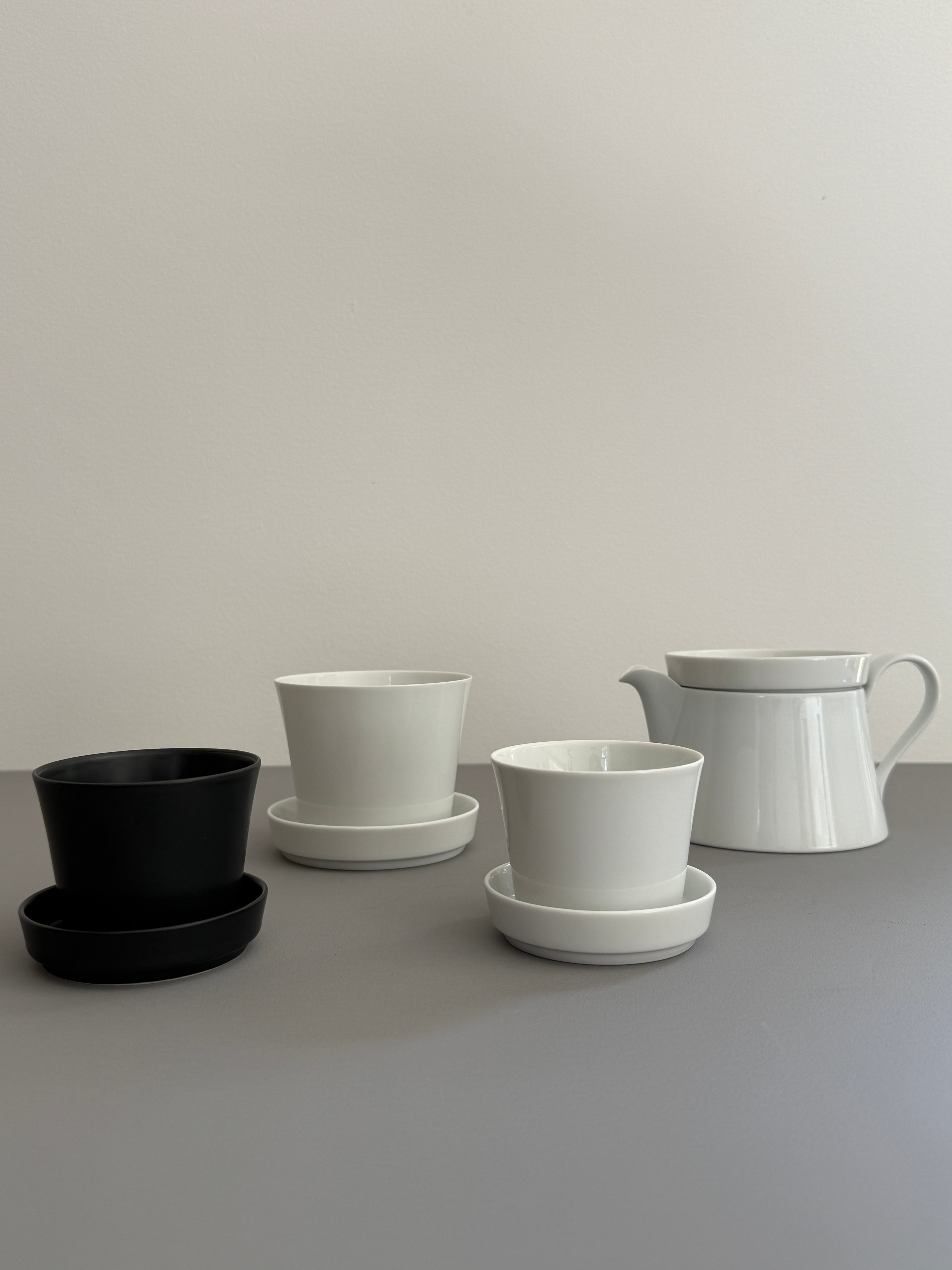 スタッキングの美学:ティーポット、カップ、ソーサーが精密に設計されており、重ね合わせることで繊細なラインが強調され、一つの彫刻のような建築的美しさが現れます。